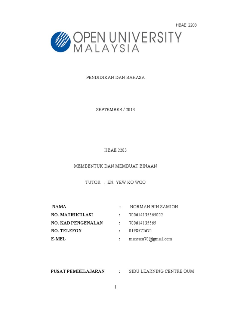 Hbae2203 Membentuk Dan Membuat Binaanseni Sept Dalam