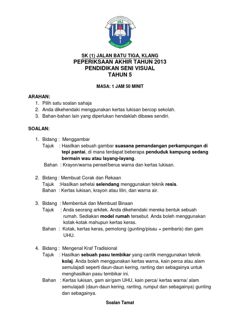 Peperiksaan Akhir Tahun Pend Seni Visual Tahun 4 Sumber Pendidikan Psv Thn 4 2017 Sks