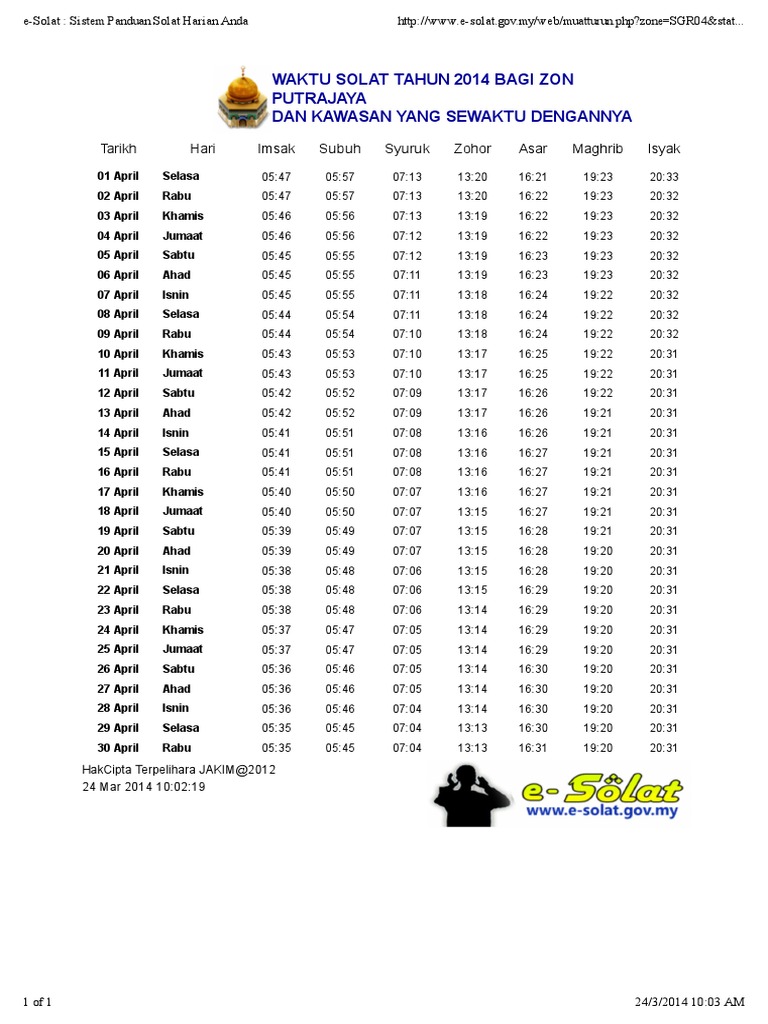 Waktu Solat Tahun 2014 Bagi Zon Putrajaya Dan Kawasan Yang Sewaktu Dengannya