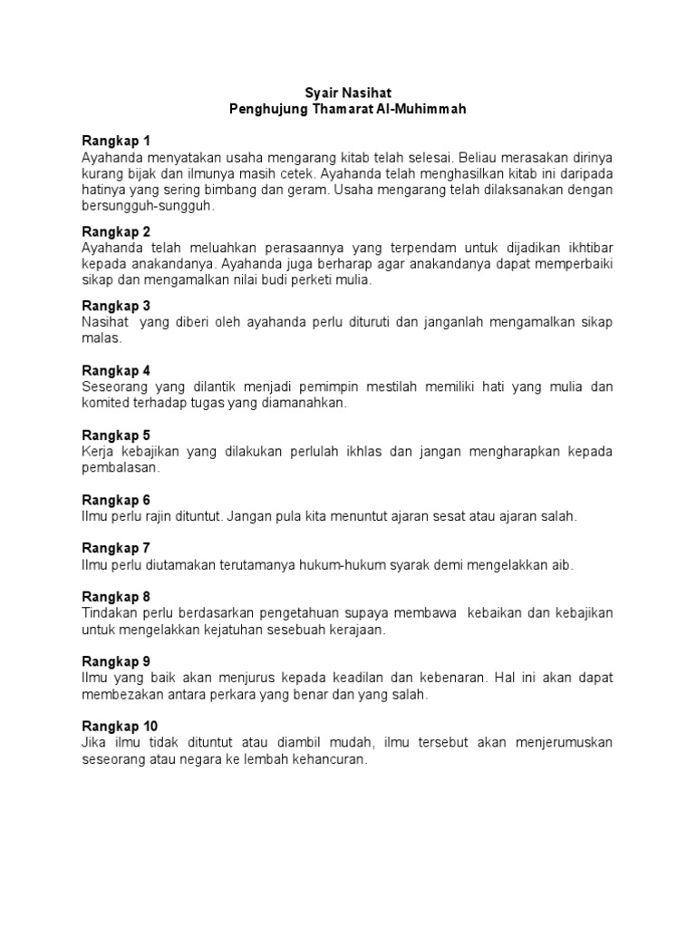 Bahasa Melayu Tingkatan 2 Syair Nasihat Penghujung Thamarat Al Muhimmat